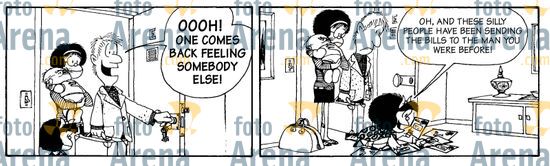 1073en TIRA MAFALDA, CÓDIGO ORIGINAL 1073, INGLÊS, EDICIONES DE LA FLORDiálogoPapa: Oooh! One comes back feeling somebody else!Mafalda: Oh, and these silly people have been sending the bills to the man you were before!