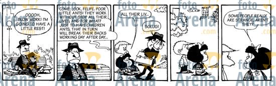 1106en TIRA MAFALDA, CÓDIGO ORIGINAL 1106, INGLÊS, EDICIONES DE LA FLORDiálogoMan: Oooh, blow work! I'm going to have a little rest!Mafalda: Come, look, Felipe. Poor little ants! They work without stop all their lives, and for what? Just to have children ants, that in turn will break their backs working day after day...Felipe: All their liv...Man: Sglug!Mafalda: Some people really are strange, aren't they?