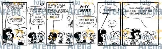 1109en TIRA MAFALDA, CÓDIGO ORIGINAL 1109, INGLÊS, EDICIONES DE LA FLORDiálogoMafalda: Last night I dreamed I was at the un, of something like that.Felipe: Something like that?Mafalda: Something like the un.Felipe: Was it of was it not the un?Mafalda: It was a huge hall full of delegates from many countries. That was the un!Miguelito: Why was? Has the un gone bust?Mafalda: No, Miguelito!Miguelito: Ah! I thought we had lost the friendly but useless people.