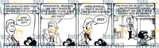 1263en TIRA MAFALDA, CÓDIGO ORIGINAL 1263, INGLÊS, EDICIONES DE LA FLORDiálogoMafalda: Papa, when you were young did old people seem shocked by your clothes?Papa: Wow! Were the just? "Disgraceful, dressing like that! Where is this going to end, I ask! In my day you didn't see that!"Mafalda: Unbelievable! That's what the oldies say now!Papa: See? and in my day we didn't dress like effeminate clowns! You didn't see the things you see now, we weren't laybouts, an...