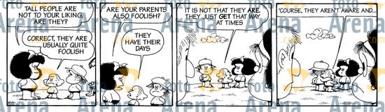 1295en TIRA MAFALDA, CÓDIGO ORIGINAL 1295, INGLÊS, EDICIONES DE LA FLORDiálogoMafalda: Tall people are not your liking, are they?Libertad: Correct, they are usually quite foolish.Mafalda: Are your parents also foolish?Libertad: They have their days; It is not that they are. They just get that way at times. 'Course, they aren't aware and...