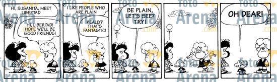 1307en TIRA MAFALDA, CÓDIGO ORIGINAL 1307, INGLÊS, EDICIONES DE LA FLORDiálogoMafalda: Hi, Susanita, meet Libertad.Susanita: Hi, Libertad! Hope we'll be good friends!Libertad: I like people who are plain.Susanita: Really? That's fantastic!Libertad: Be plain, let's see? Try! Oh dear!