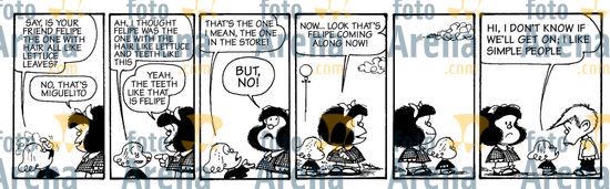 1326en TIRA MAFALDA, CÓDIGO ORIGINAL 1326, INGLÊS, EDICIONES DE LA FLORDiálogoLibertad: Say, is your friend Felipe the one with hair all like lettuce leaves?Mafalda: No, that's Miguelito.Libertad: Ah, I thought Felipe was the one with the hair like lettuce and teeth like this.Mafalda: Yeah, the teeth like that is Felipe.Libertad: That's the one I mean, the one in the store!Mafalda: But, no! Now, look that's Felipe coming along now!Libertad: Hi, I don't know if we'll get on; I like simple people.