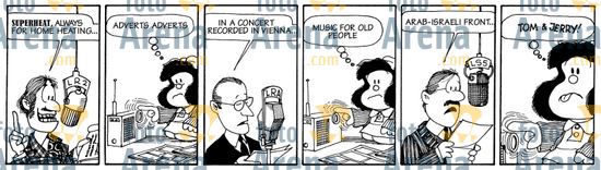 1353en TIRA MAFALDA, CÓDIGO ORIGINAL 1353, INGLÊS, EDICIONES DE LA FLORDiálogoMan: Superheat, always for home heating...Mafalda: Adverts, adverts.Man: In a concert recorded in vienna...Mafalda: Music for old people.Man: Arab-Israeli front...Mafalda: Tom & Jerry!