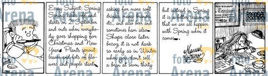 1390en TIRA MAFALDA, CÓDIGO ORIGINAL 1390, INGLÊS, EDICIONES DE LA FLORDiálogoManolito: Essay Subject: Spring . Spring picks off and starts on 21 September and ends when everbody goes shopping for Christmas and New Year. Plants sprout leves and lots of flowers and people start asking for more doft drinks, many brands, etc, and also beer and sometimes ham also shops chose later becaz it is not dark so early as in Winter when you don't sell a bean at seven thirty but instead in Spring it is a better season so that we are all happier with Spring when it comes Manuel Gireiro.