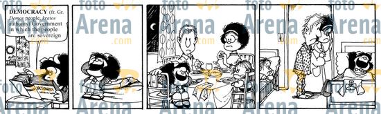 1503en TIRA MAFALDA, CÓDIGO ORIGINAL 1503, INGLÊS, EDICIONES DE LA FLORDiálogoMafalda: DEMOCRACY (fr. Gr. Demos people, kratos authority) Government in which the people are sovereign.