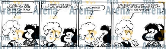 1593en TIRA MAFALDA, CÓDIGO ORIGINAL 1593, INGLÊS, EDICIONES DE LA FLORDiálogoSusanita: I have nothing against the poor, on the contrary. I think they need help and understanting and more! I am convinced that the great majority of poor people do not do it on purpose.
