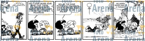 1605en TIRA MAFALDA, CÓDIGO ORIGINAL 1605, INGLÊS, EDICIONES DE LA FLORDiálogoMafalda: Did it ever cross your mind that these youths who now suffer because adults do not let them progress. Will be the same people who tomorrow. When adults will block our chance to get ahead?Miguelito: No, sorry, never gave it a thought.
