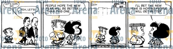 1646en TIRA MAFALDA, CÓDIGO ORIGINAL 1646, INGLÊS, EDICIONES DE LA FLORDiálogoMan 1: Let's hope so!Man 2: Yeh, let's!Manolito: People hope the new year will be better than this one.Mafalda: I'll bet the new year is hoping people will get better.