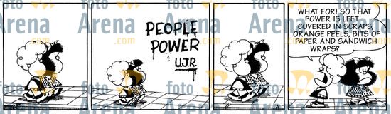 1654en TIRA MAFALDA, CÓDIGO ORIGINAL 1654, INGLÊS, EDICIONES DE LA FLORDiálogo"PEOPLE POWER U.J.R."Susanita: What for! So that power is left covered in scraps, orange peels, bits of paper and sandwich wraps?
