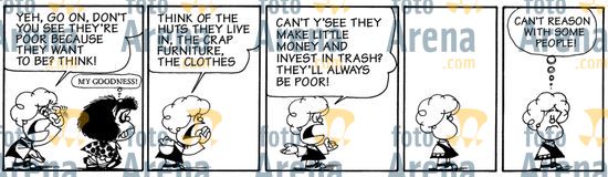 1787en TIRA MAFALDA, CÓDIGO ORIGINAL 1787, INGLÊS, EDICIONES DE LA FLORDiálogoSusanita: Yeh, go on, don't you see they're poor because they want to be? Think!Mafalda: My goodness!Susanita: Think of the huts they live in, the crap furniture, the clothes. Can't y'see they make little money and invest in trash? They'll always be poor! Can't reason with some people!