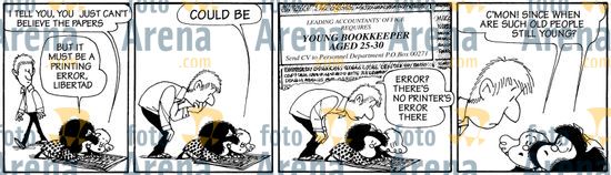 1799en TIRA MAFALDA, CÓDIGO ORIGINAL 1799, INGLÊS, EDICIONES DE LA FLORDiálogoLibertad: I tell you, you just can't believe the papers.Mafalda: But it must be a printing error, Libertad.Libertad: Could be. Leading acountants office requieres. Young Bookkeeper aged 25-30. Send CV to Personnel Departament P.O. Box, 00271.Papa: Error? There's no printer's error there.Libertad and Mafalda: C'mon! Since when are such old people still young?