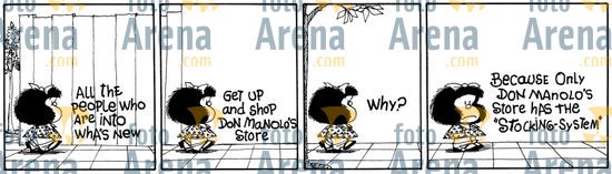 1806en TIRA MAFALDA, CÓDIGO ORIGINAL 1806, INGLÊS, EDICIONES DE LA FLORDiálogoMafalda:All the people who are into wha's new. Get up and shop Don Manolo's Store. Why? Because only Don Manolo's Store has the "Stocking-System".