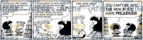 1807en TIRA MAFALDA, CÓDIGO ORIGINAL 1807, INGLÊS, EDICIONES DE LA FLORDiálogoMafalda: You really get funny sale ideas, Manolito, what on earth is the "Rocking-system" you've got now?Manolito: It's exclusive to Don Manolo's store for people who are into what's new... If you are into the new, the "Rocking-system" helps you shop for some goods at rock-bottom prices.Mafalda: Fine, what about quality?Manolito: You can't be into the new if you have prejudices!