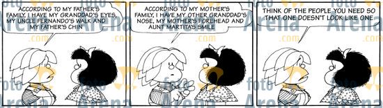 1814en TIRA MAFALDA, CÓDIGO ORIGINAL 1814, INGLÊS, EDICIONES DE LA FLORDiálogoMiguelito: According to my father's family, I have my granddad's eyes, my uncle Fernando's walk and my father's chin. According to my mother's family, I have my other granddad's nose, my mother's forehead and aunt Martita's smile. Think of the people you need so that one doesn't look like one.
