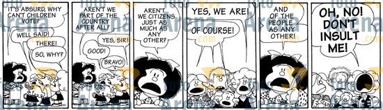 1826en TIRA MAFALDA, CÓDIGO ORIGINAL 1826, INGLÊS, EDICIONES DE LA FLORDiálogoMafalda: It's absurd, why can't children vote?Miguelito: Well said!Felipe: There!Susanita: So, why?Mafalda: Aren't we part of the country after all?Susanita: Yes, sir!Miguelito: Good!Felipe: Bravo!Mafalda: Aren't we citizens just as much as any other?Susanita: Yes, we are!Miguelito, Felipe and Libertad: Of course.Mafalda: And of the people as any other!Susanita: Oh, no! don't insult me!