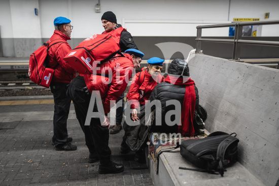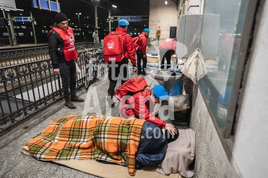 ny100226232512 **EMBARGO: No electronic distribution, Web posting or street sales before WEDNESDAY, 12:01 A.M. ET, FEB. 11, 2026. No exceptions for any reasons. EMBARGO set by source.** Volunteers help a homeless person at the Garibaldi station in Milan on Sunday, Feb. 8, 2026. Six homeless people have died in the Italian city in recent weeks, highlighting the widening inequality as the Games unfold there. (Alessandro Grassani/The New York Times/Fotoarena)
