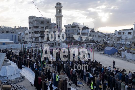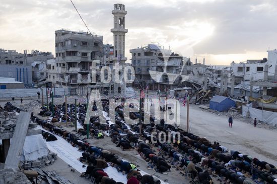 ny200326115912 People perform a prayer for Eid al-Fitr alongside the ruins of the destroyed al-Yarmouk Mosque in central Gaza City, on Friday, March 20, 2026. (Saher Alghorra/The New York Times/Fotoarena)