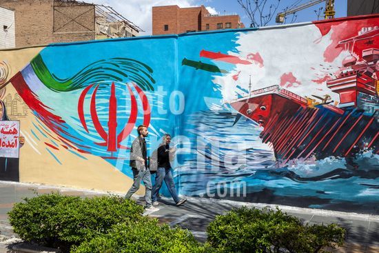 ny080426125611 People in Tehran, on April 8, 2026, walk by a mural depicting Iranian missiles attacking a U.S. aircraft carrier after an announcement of a two-week ceasefire in the war with the United States and Israel. (Arash Khamooshi/The New York Times/Fotoarena)