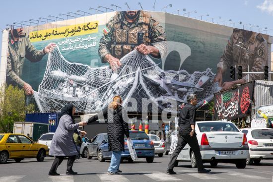 ny050426122712 People walk in front of a billboard depicting captured U.S. aircraft in a net in Tehran, Iran, Sunday, April 5, 2026. President Trump used an expletive-laden social media post to taunt Iranian leaders, saying that the United States would attack if they did not fully reopen the Strait of Hormuz. (Arash Khamooshi/The New York Times/Fotoarena)