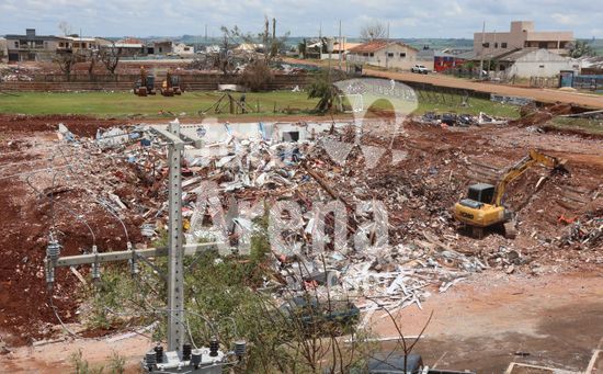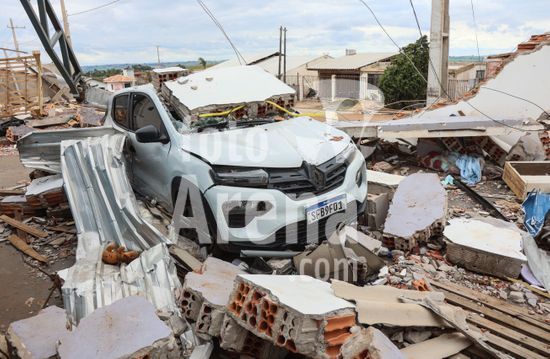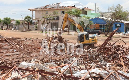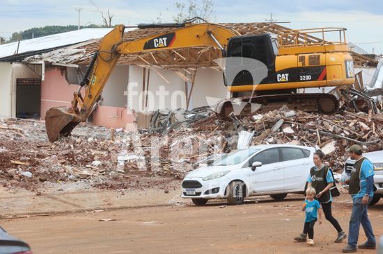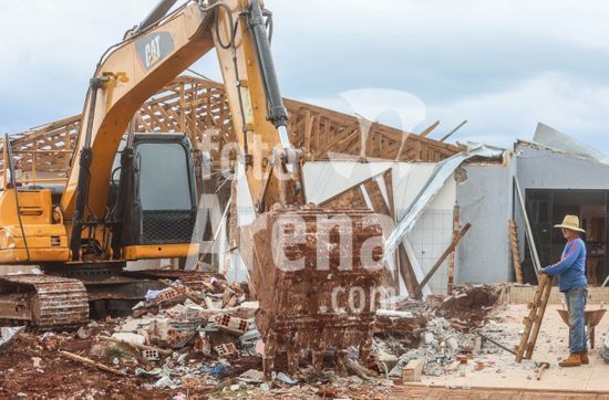 2843825 Máquinas, voluntários de diversos órgãos do governo do estado e da prefeitura de Rio Bonito do Iguaçu, no Sudoeste do Paraná, estão atuando em conjunto para demolir casas e pontos de comércio, condenados pela Defesa Civil, após um tornado destruir 90% da cidade na noite da última sexta-feira (7). O fenômeno climático foi reclassificado como F3 na Escala Fujita, segundo o SIMEPAR, com ventos superiores a 250 km/h. O tornado deixou um rastro de destruição na área urbana e rural do município. Cerca de 4000 pessoas estão desabrigadas, 700 ficaram feridos e cinco pessoas morreram.