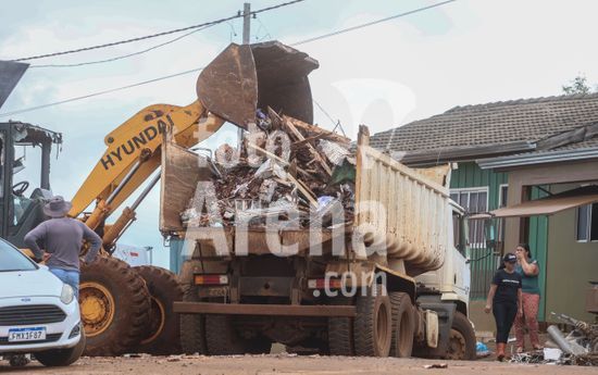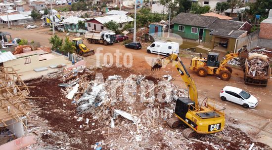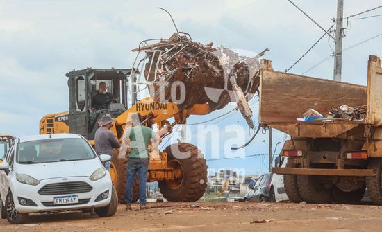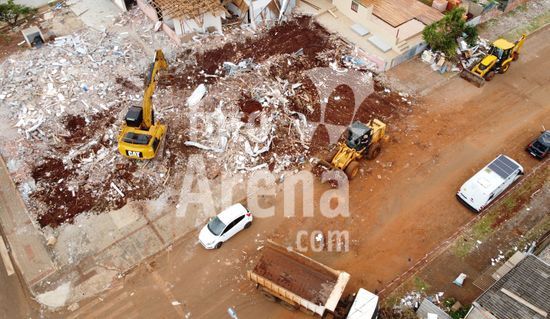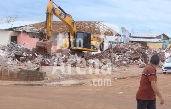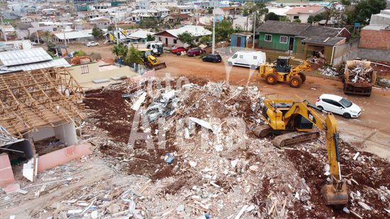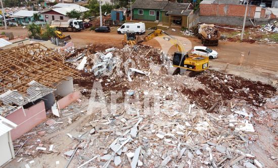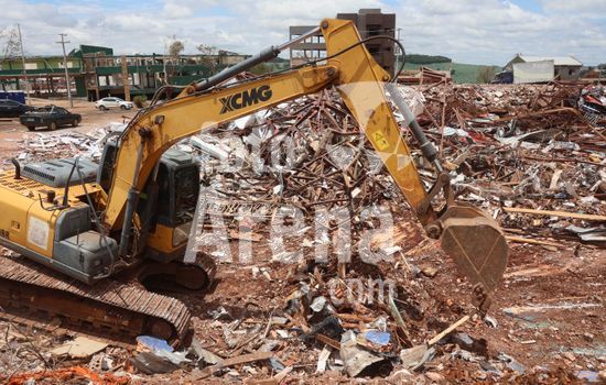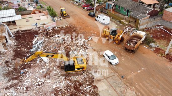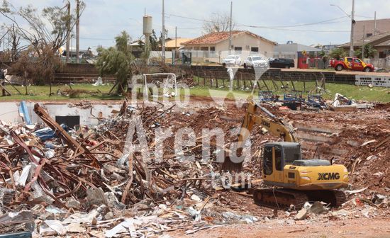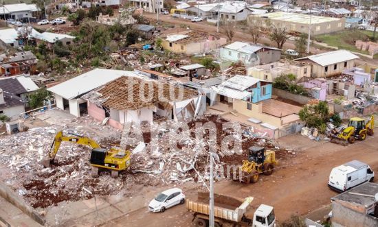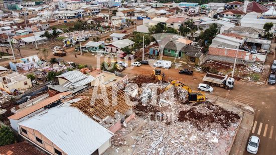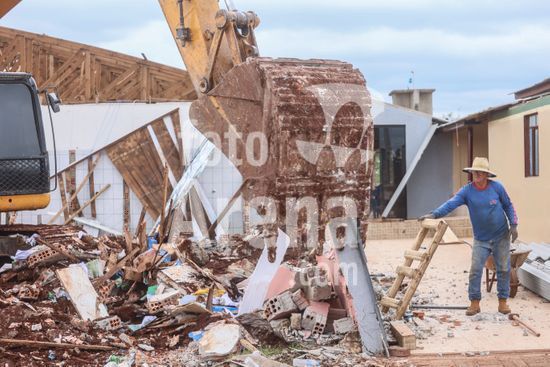 2843731 Máquinas, voluntários de diversos órgãos do governo do estado e da prefeitura de Rio Bonito do Iguaçu, no Sudoeste do Paraná, estão atuando em conjunto para demolir casas e pontos de comércio, condenados pela Defesa Civil, após um tornado destruir 90% da cidade na noite da última sexta-feira (7). O fenômeno climático foi reclassificado como F3 na Escala Fujita, segundo o SIMEPAR, com ventos superiores a 250 km/h. O tornado deixou um rastro de destruição na área urbana e rural do município. Cerca de 4000 pessoas estão desabrigadas, 700 ficaram feridos e cinco pessoas morreram.