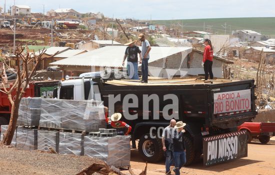 2843851 Máquinas, voluntários de diversos órgãos do governo do estado e da prefeitura de Rio Bonito do Iguaçu, no Sudoeste do Paraná, estão atuando em conjunto para demolir casas e pontos de comércio, condenados pela Defesa Civil, após um tornado destruir 90% da cidade na noite da última sexta-feira (7). O fenômeno climático foi reclassificado como F3 na Escala Fujita, segundo o SIMEPAR, com ventos superiores a 250 km/h. O tornado deixou um rastro de destruição na área urbana e rural do município. Cerca de 4000 pessoas estão desabrigadas, 700 ficaram feridos e cinco pessoas morreram.