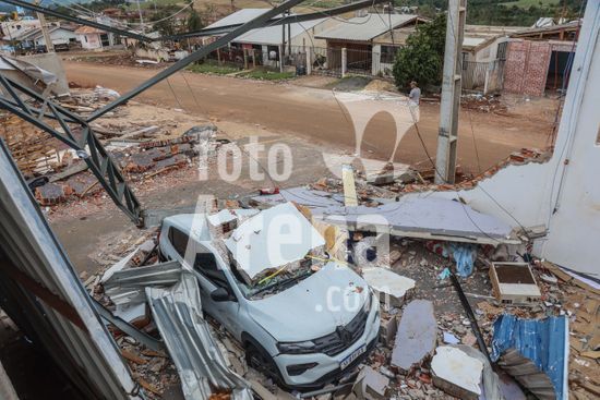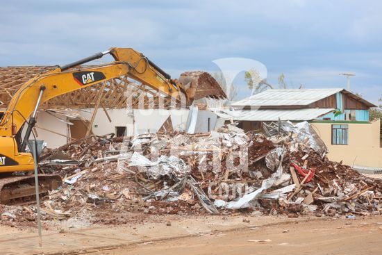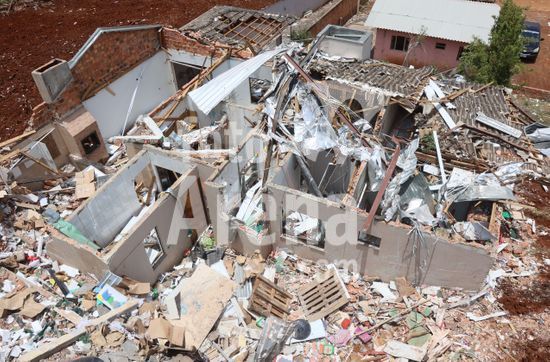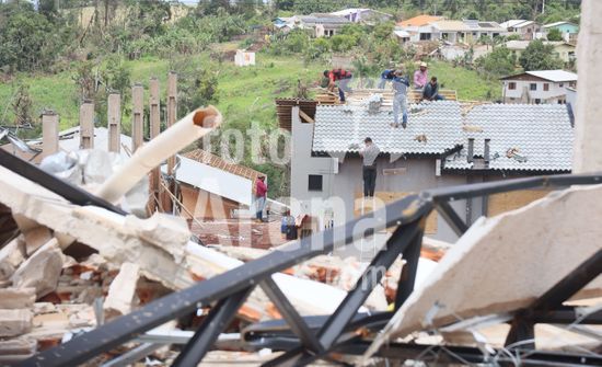 2843821 Máquinas, voluntários de diversos órgãos do governo do estado e da prefeitura de Rio Bonito do Iguaçu, no Sudoeste do Paraná, estão atuando em conjunto para demolir casas e pontos de comércio, condenados pela Defesa Civil, após um tornado destruir 90% da cidade na noite da última sexta-feira (7). O fenômeno climático foi reclassificado como F3 na Escala Fujita, segundo o SIMEPAR, com ventos superiores a 250 km/h. O tornado deixou um rastro de destruição na área urbana e rural do município. Cerca de 4000 pessoas estão desabrigadas, 700 ficaram feridos e cinco pessoas morreram.
