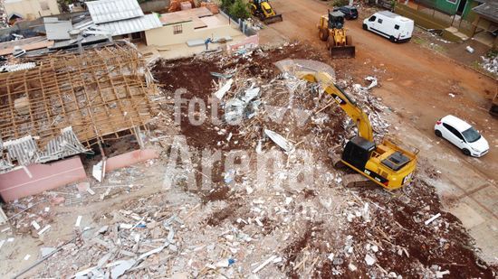 2843785 Máquinas, voluntários de diversos órgãos do governo do estado e da prefeitura de Rio Bonito do Iguaçu, no Sudoeste do Paraná, estão atuando em conjunto para demolir casas e pontos de comércio, condenados pela Defesa Civil, após um tornado destruir 90% da cidade na noite da última sexta-feira (7). O fenômeno climático foi reclassificado como F3 na Escala Fujita, segundo o SIMEPAR, com ventos superiores a 250 km/h. O tornado deixou um rastro de destruição na área urbana e rural do município. Cerca de 4000 pessoas estão desabrigadas, 700 ficaram feridos e cinco pessoas morreram.