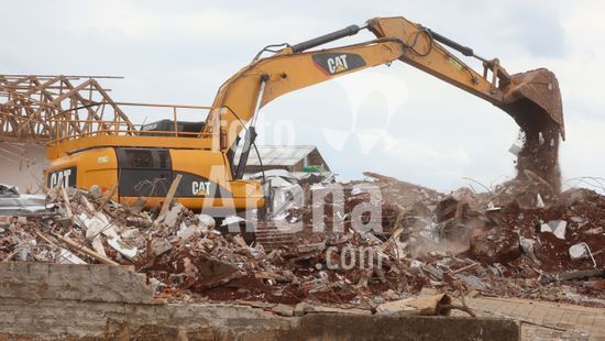 2843855 Máquinas, voluntários de diversos órgãos do governo do estado e da prefeitura de Rio Bonito do Iguaçu, no Sudoeste do Paraná, estão atuando em conjunto para demolir casas e pontos de comércio, condenados pela Defesa Civil, após um tornado destruir 90% da cidade na noite da última sexta-feira (7). O fenômeno climático foi reclassificado como F3 na Escala Fujita, segundo o SIMEPAR, com ventos superiores a 250 km/h. O tornado deixou um rastro de destruição na área urbana e rural do município. Cerca de 4000 pessoas estão desabrigadas, 700 ficaram feridos e cinco pessoas morreram.