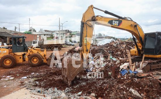 2843820 Máquinas, voluntários de diversos órgãos do governo do estado e da prefeitura de Rio Bonito do Iguaçu, no Sudoeste do Paraná, estão atuando em conjunto para demolir casas e pontos de comércio, condenados pela Defesa Civil, após um tornado destruir 90% da cidade na noite da última sexta-feira (7). O fenômeno climático foi reclassificado como F3 na Escala Fujita, segundo o SIMEPAR, com ventos superiores a 250 km/h. O tornado deixou um rastro de destruição na área urbana e rural do município. Cerca de 4000 pessoas estão desabrigadas, 700 ficaram feridos e cinco pessoas morreram.