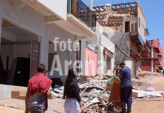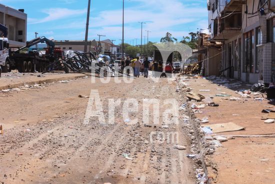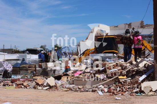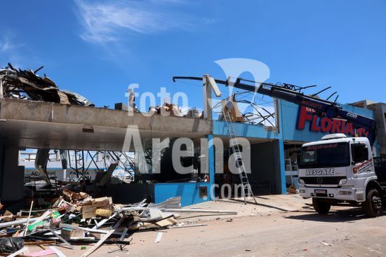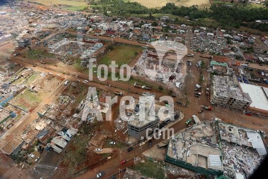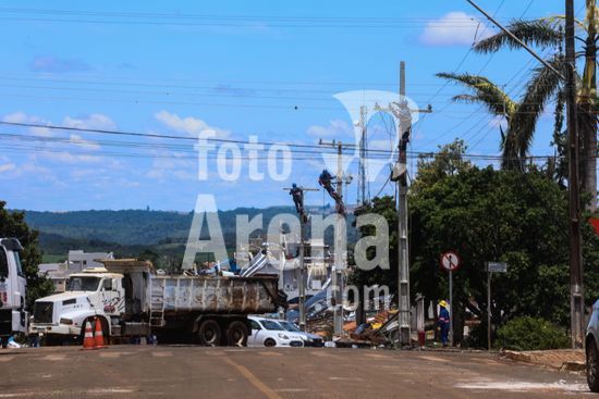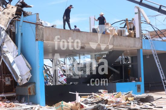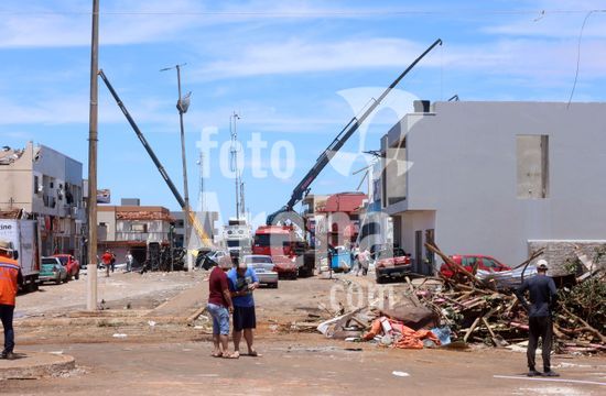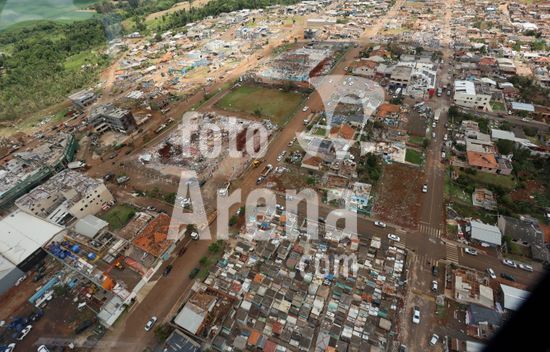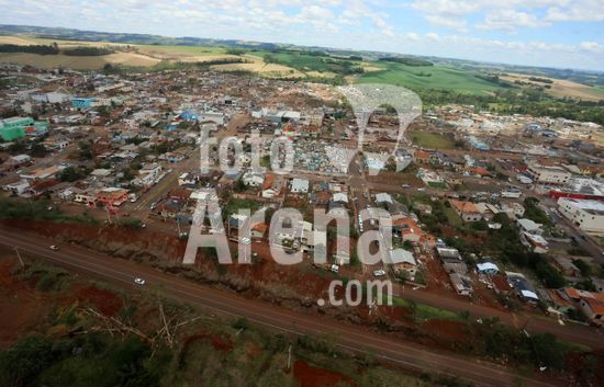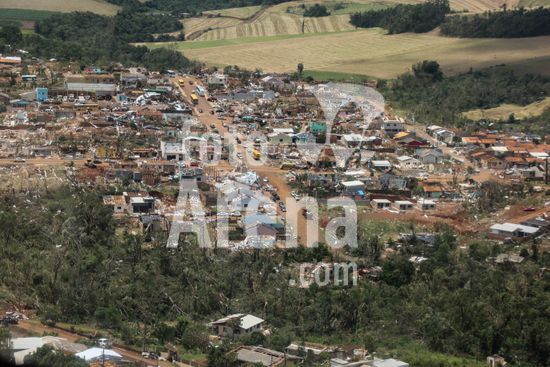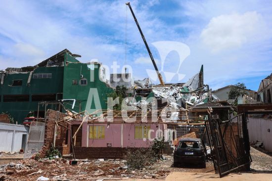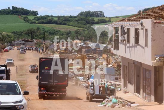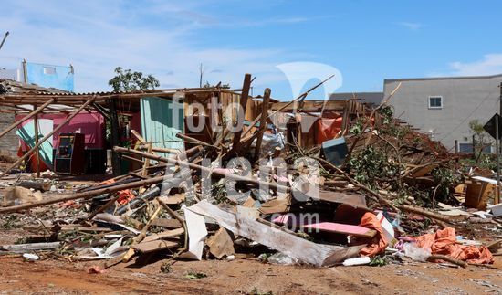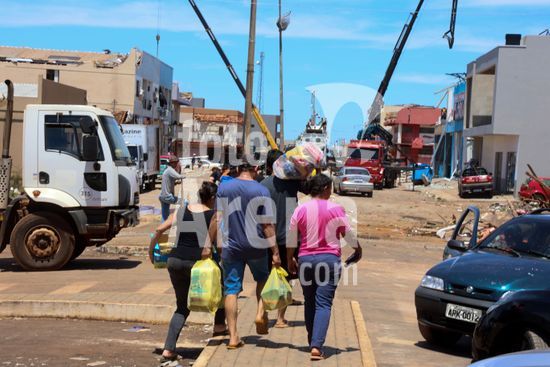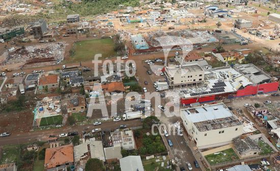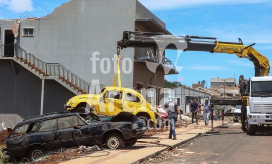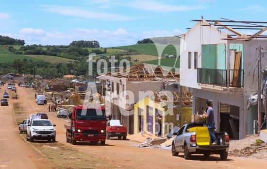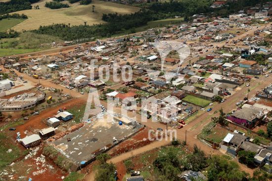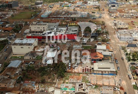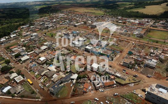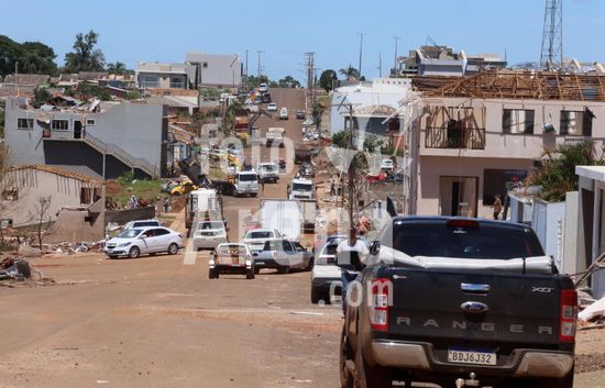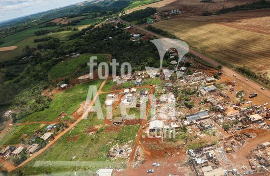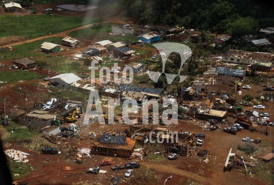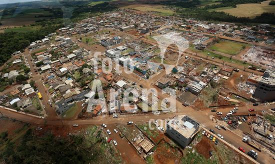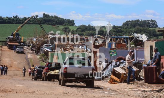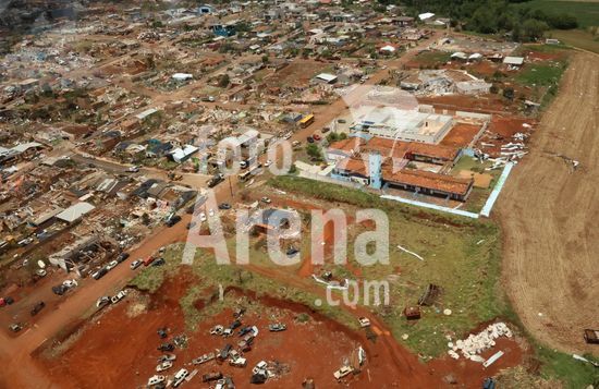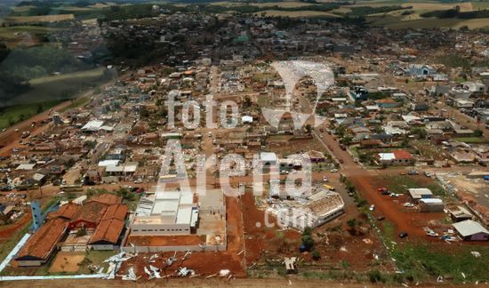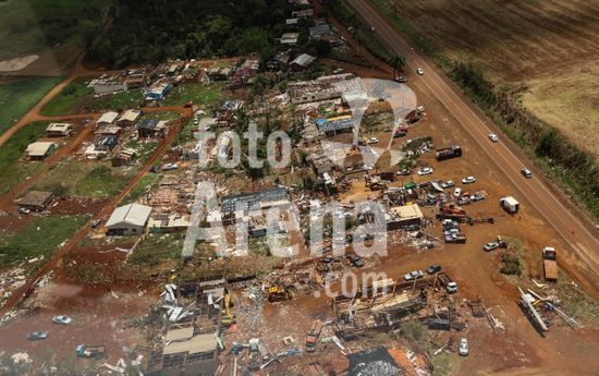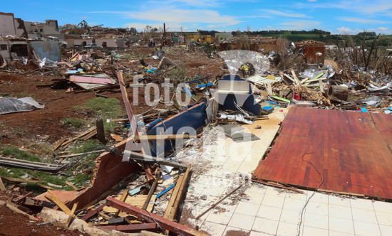 Moradores, equipes da Defesa Civil, Polícia Militar, Sanepar, Copel, e Saúde Estadual atuam em conjunto na reconstrução de Rio Bonito do Iguaçu, no Sudoeste do Paraná, após o município ter 90% da cidade destruída por um tornado na noite da última sexta-feira (7). O fenômeno foi reclassificado como F3 na Escala Fujita, segundo o SIMEPAR, com ventos de até 250 km/h. O tornado deixou um rastro de destruição na área urbana e rural do município. Cerca de 4000 pessoas estão desabrigadas, 700 ficaram feridos e cinco pessoas morreram. Na foto, cidade destruída pelo tornado.