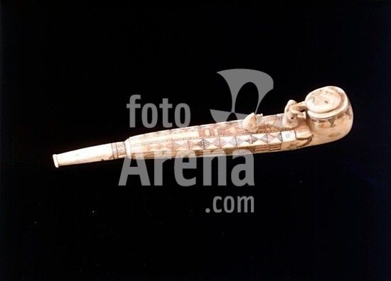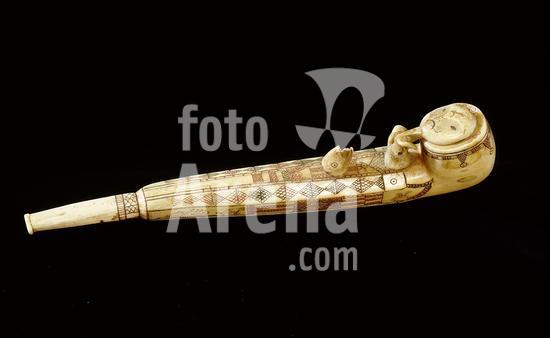 akg261491 Inuit (Eskimo), Alaska, Point Hope, undat. Tobacco pipe; the pipe bowl cover shows a female face, the pipe is decorated with walrus and polar bear heads. Walrus tooth. Alaska Gallery of Eskimo Art.