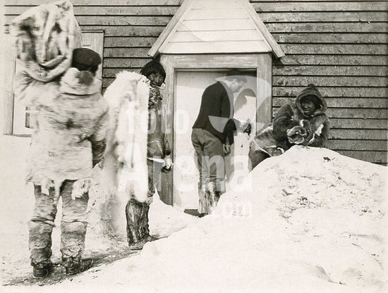 ado00104658 Inuit coming to sell polar fox skins and a polar bear skin in a counter of a fur sales company (North America). Ca. 1910. Author: Unknown photographer.