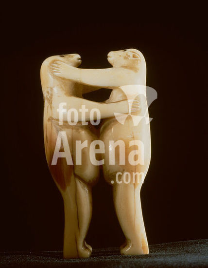 akg143272 Inuit (Eskimo), Northwest coast, 19th century. Tow polar bears fighting. Walrus tooth, height 8cm. Alaska Gallery of Eskimo Art. Museum: Alaska Gallery of Eskimo Art.