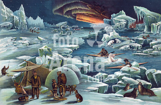 akg8212042 Géographie et Géographes / 19e siècle. Yaggy, Levi Walter (1848-?). "Le monde arctique". On distingue des lions de mer, des pingouins, et des ours polaires, la banquise, une aurore boréale, des Esquimaux près de leurs igloos avec des kayaks. (L'Arctique est la région entourant le pôle Nord de la Terre, à l'intérieur et aux abords du cercle polaire arctique. L'Arctique est souvent le théâtre des magnifiques aurores boréales). Chromolithographie, 1893. Collection privée.