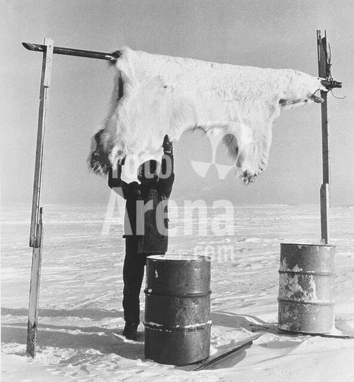 akg265547 Ethnology:. Eskimos (Inuit). Inuit hangs the fur of an icebear on a rail for drying. Foto, Kanada, 1976.