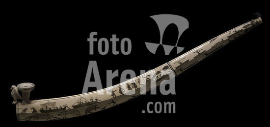 alb1460362 Walrus tusk carved as an ornamental pipe featuring hunting scenes with bears, caribou, musk oxen and whales, men in boats and dancers in igloos, 1880-1950. By unknown Inupiaq and Inuit artists. Ivory and ink. Northern Alaska. Denver Art Museum. Denver, Colorado, United States.