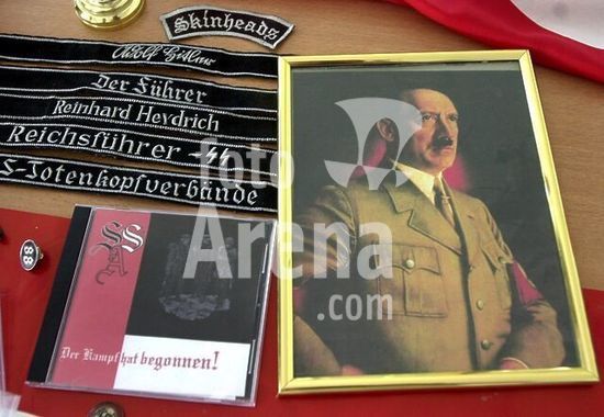 dpa7371363 (dpa) - Right extremist propaganda material including a Hitler portrait were confiscated by police in Halberstadt, eastern Germany, 3 September 2003. Police and the state attorney office have smashed a ring of Neo Nazis and seized the material in a raid of private homes of skinheads.