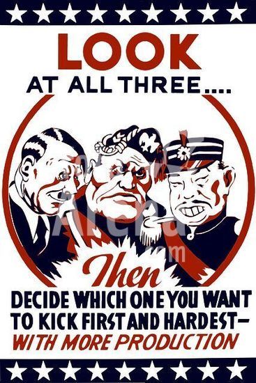 alb3883654 Vintage World War II propaganda poster featuring Hitler, Mussolini, and Hirohito. It reads, Look At All Three...Then Decide Which One You Want To Kick First And Hardest - With More Production.