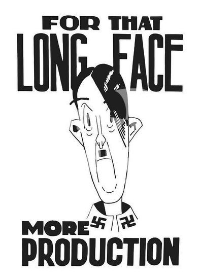 alb3884388 Vintage World War II propaganda poster featuring a caricature of Adolf Hitler with a long stretched face. It reads, For That Long Face More Production.