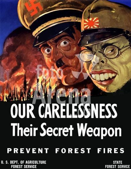 alb3885075 Vintage World War II poster showing caricatures of Adolf Hitler and Hideki Tojo looking over a blazing forest fire.  It reads, Our carelessness, their secret weapon -- Prevent Forest Fires -- U.S. Department Of Agriculture Forest Service -- State Forest Service.