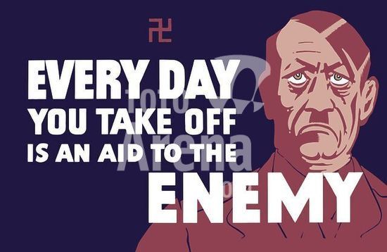 alb3887368 Vintage World War II propaganda poster featuring a cartoon version of Adolf Hitler. It reads, Every day you take off is an aid to the enemy.