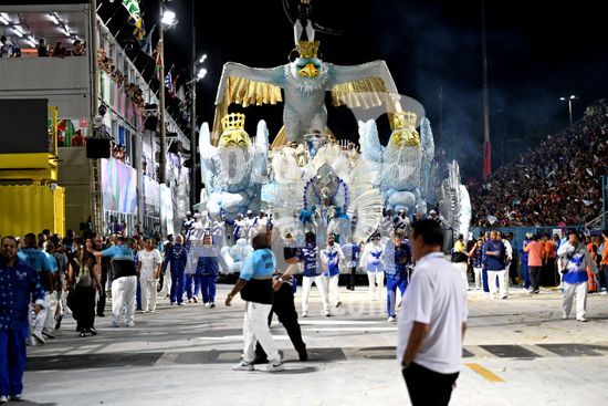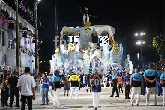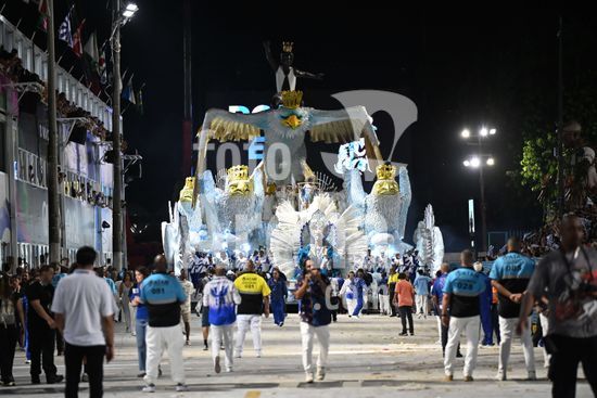 2887575 Portela desfila na noite de hoje, 15 de fevereiro de 2026, na Marquês de Sapucaí, pela Série Especial do Carnaval do Rio, com o enredo?O mistério do príncipe do Bará ? a oração do Negrinho e a ressurreição de sua coroa sob o céu aberto do Rio Grande?Carro alegórico entra com atraso na avenida.
