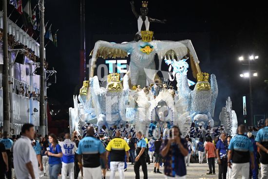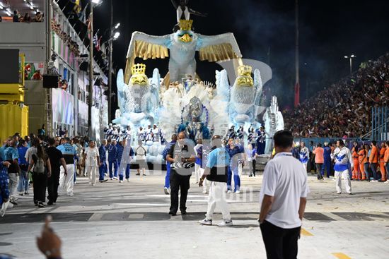 2887579 Portela desfila na noite de hoje, 15 de fevereiro de 2026, na Marquês de Sapucaí, pela Série Especial do Carnaval do Rio, com o enredo?O mistério do príncipe do Bará ? a oração do Negrinho e a ressurreição de sua coroa sob o céu aberto do Rio Grande?Carro alegórico entra com atraso na avenida.