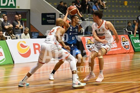 2835369 Imagens da partida de basquete entre o Caxias do Sul Basquete e Rio Claro, disputada no Ginásio do SESI, válida pela quarta rodada do Caxias do Sul Basquete no NBB 25/26. Humberto eFAbrizzio do CAxias do Sul BAsquete e Rikalo do Rio Claro. Caxias do Sul, RS (03).