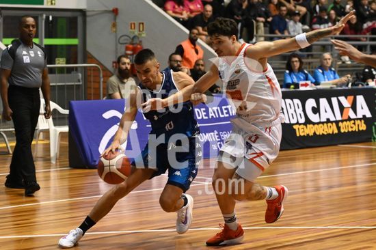 2835381 Imagens da partida de basquete entre o Caxias do Sul Basquete e Rio Claro, disputada no Ginásio do SESI, válida pela quarta rodada do Caxias do Sul Basquete no NBB 25/26. Humberto do Caxias do Sul Basquete e Carlos Jr do Rio Claro.Caxias do Sul, RS (03).