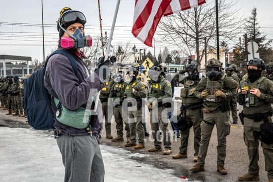 A demonstrator holds an American flag near a line of federal agents guarding the Whipple Federal Building in Minneapolis, on Thursday, Jan. 8, 2026. A federal immigration agent fatally shot a woman in Minneapolis on Wednesday, the latest escalation in the Trump administration?s immigration crackdown in Minnesota. (David Guttenfelder/The New York Times/Fotoarena)