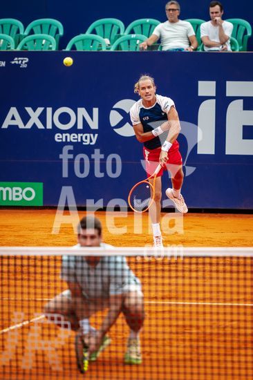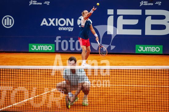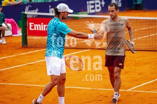 2886332 Buenos Aires, Argentina. 15 de fevereiro de 2026. Rafael Matos (BRA) e Orlando Luz (BRA) em ação durante a final de duplas do Argentina Open 2026.