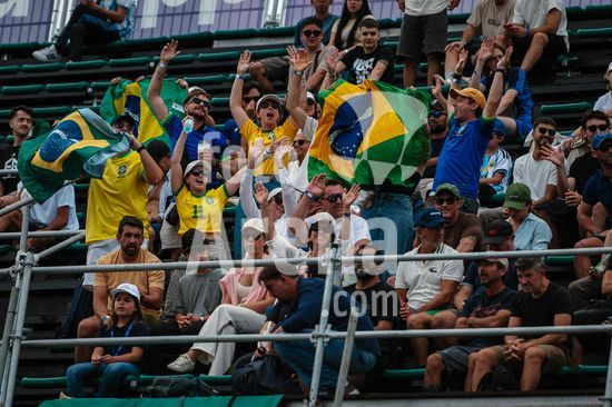 2886331 Buenos Aires, Argentina. 15 de fevereiro de 2026. Rafael Matos (BRA) e Orlando Luz (BRA) em ação durante a final de duplas do Argentina Open 2026.